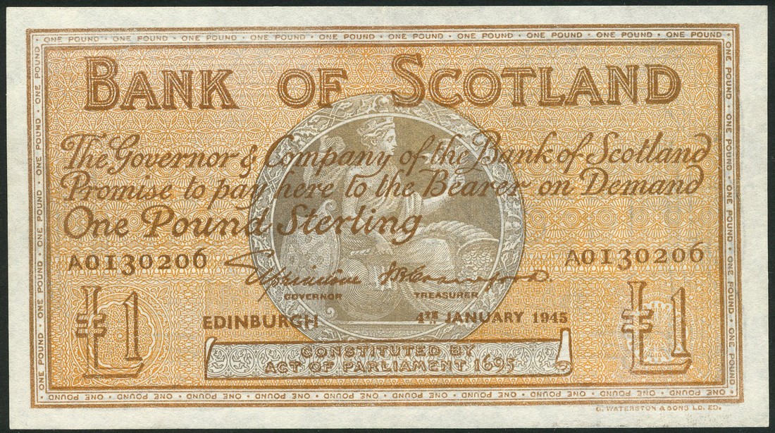 Bank of Scotland, £1 (4), orange brown, Scotia in grey circular frame at centre, Elphinstone and Crawford (3), Elphinstone and Watson (1) signatures