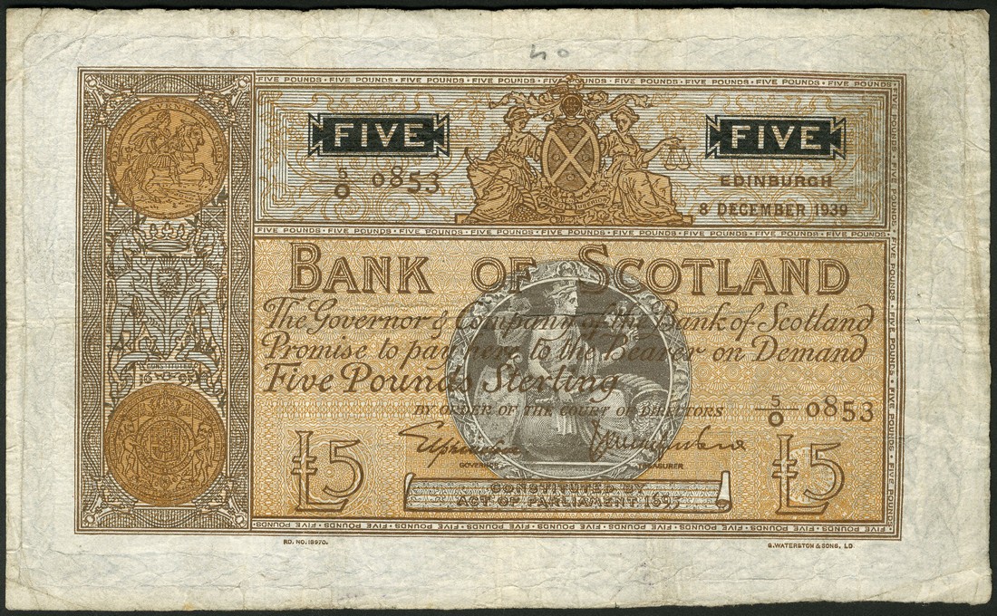 Bank of Scotland, £5, 8 December 1939, 5/0 0853, orange brown, Scotia in grey circular frame at centre, arms at left, Elphinstone and Beveridge signatures, also £5 (2), 1945, 1955, smaller format, the 1955 with blue frame at centre, Elphinstone and Crawford and Craig and Watson signatures