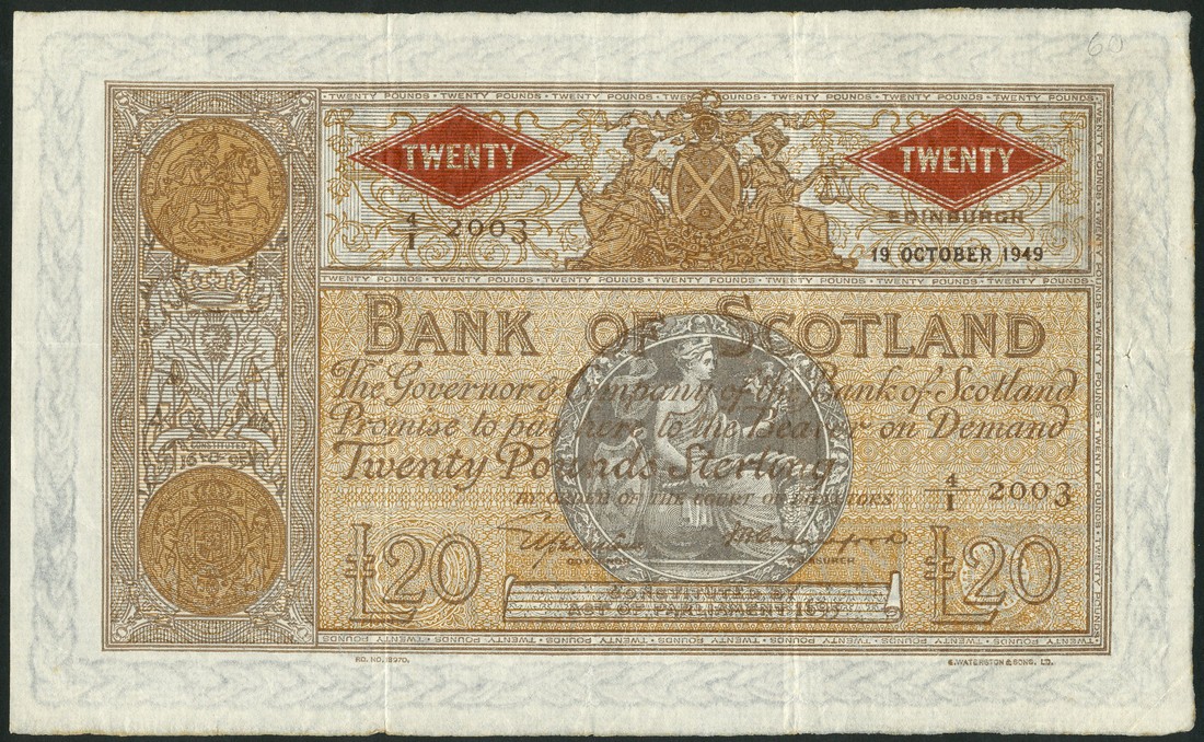 Bank of Scotland, £20, 19 October 1949, serial number 4/I 2003, brown on tan and grey underprint, arms at top centre and centre left, coins at top and bottom left