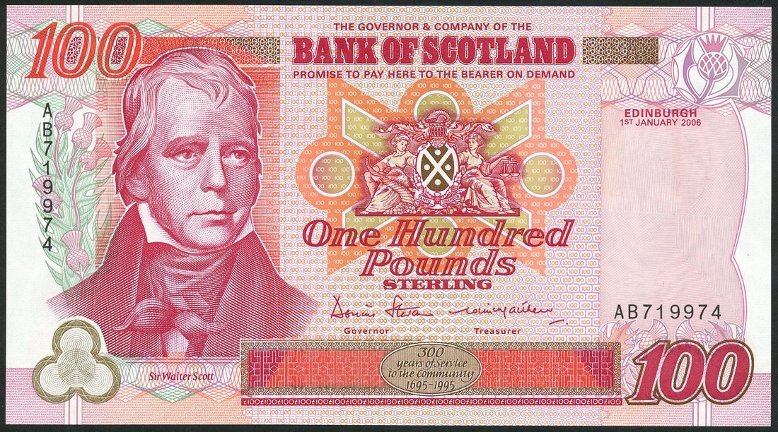 Bank of Scotland, a group of high number last prefixes for the Bank of Scotland Tercentenary Issue, comprising £5, 1. 1. 2006, serial number CH599966, blue and purple on multicoloured underprint, £10, 1. 1. 2006, serial number FX999966, brown and olive-green on multicoloured underprint, £50, 1. 1. 2006, serial number AD099975, green on multicoloured underprint, and £100, 1. 1. 2006, serial number AB719974, red on multicoloured underprint, all Stevenson and Matthew signatures, Sir Walter Scott at left, reverse scenes illustrating the Bank of Scotland's work with the Scottish community (Douglas 134-6, 135-6, 137-5, 138-5; Pick 119e, 120f, 122d, 123e),