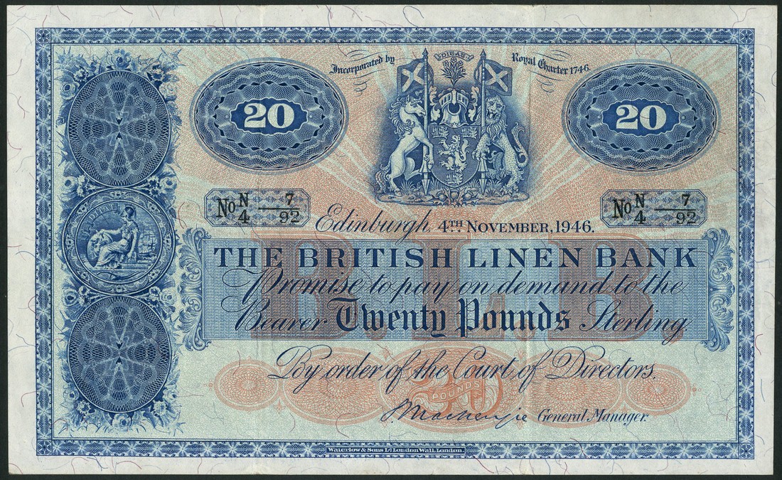 British Linen Bank, £20, 4 November 1946, serial number N/4 7/92, blue, bank initials, value and sun burst in red, arms top centre, Britannia at left, one manuscript and one printed signature of Mackenzie low centre, reverse blue