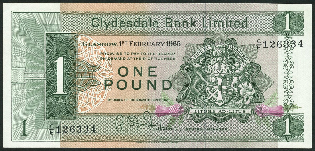 Clydesdale and North of Scotland Bank Limited, £1 (2), 1961,1963, green, Fairbairn signature, Clydesdale Bank Limited, £1 (2), 1965,1967, design as previous, £1 (2), 1974,1985, green, Robert the Bruce at left,