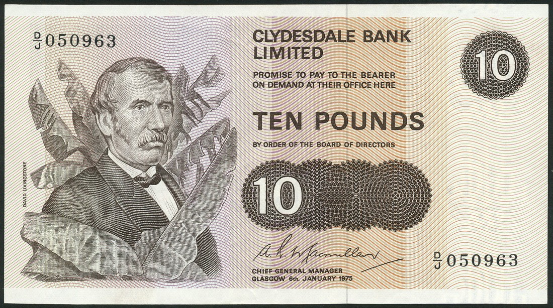 Clydesdale Bank Limited, £10, 6 January 1975, serial number D/J 050963, brown on multicolour underprint, David Livingstone at left, value at centre and top right
