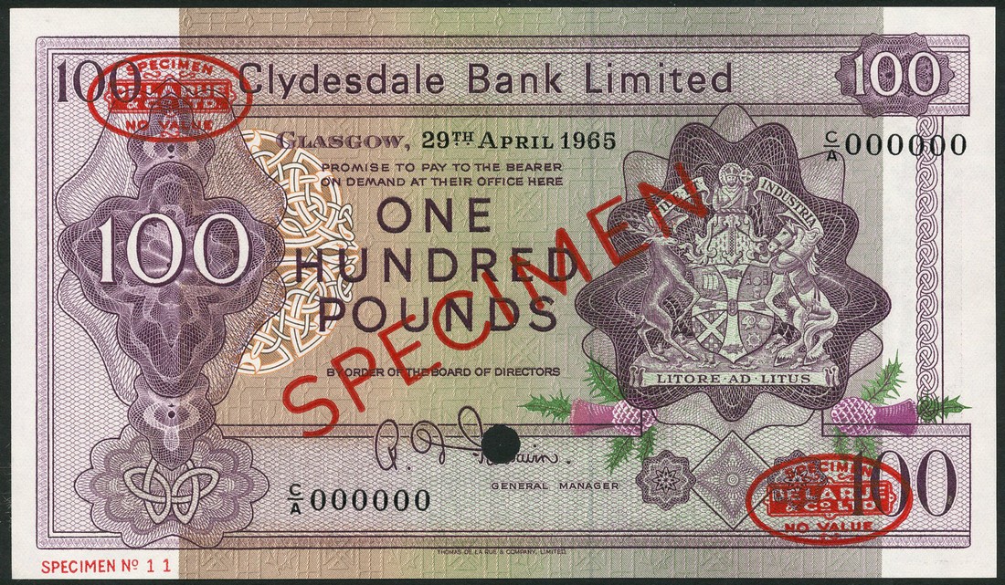 (†) Clydesdale Bank Limited, specimen £20, 19 November 1964, serial number C/A 000000, signature Fairbairn, carmine on multicoloured underprint, arms at right, value in ornate guilloche at left, reverse George Square, Glasgow; also specimen £100, 29 April 1965, serial number C/A 000000, signature Fairbairn, violet on multicoloured underprint, arms at right, value in ornate guilloche at left, reverse river bridge, both overprinted SPECIMEN in red with two De La Rue specimen ovals on obverse and reverse, one punch hole