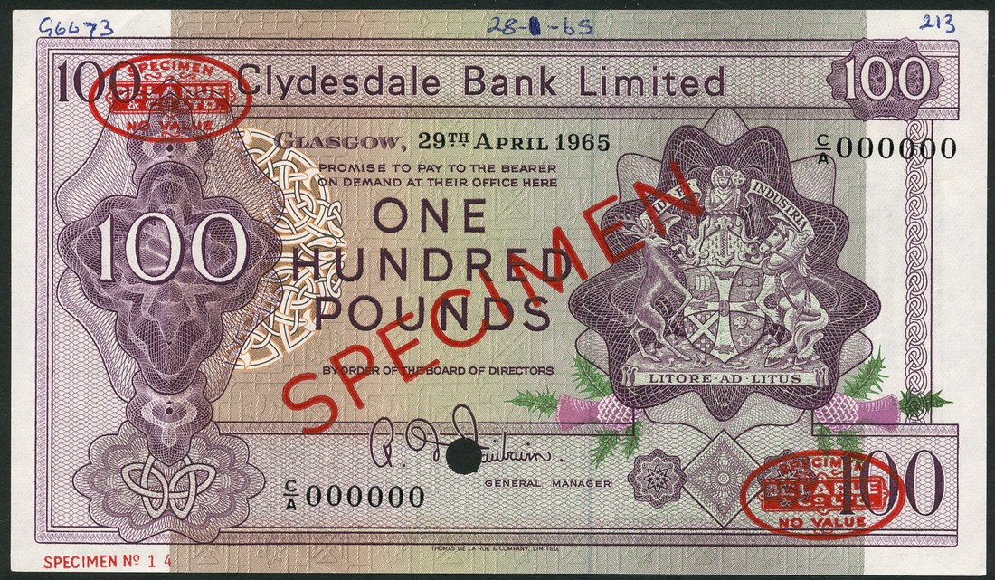 (†) Clydesdale Bank Limited, specimen £100, 29 April 1965, serial number C/A 000000, signature Fairbairn, violet on multicoloured underprint, arms at right, value in ornate guilloche at left, reverse river bridge and river scene, overprinted SPECIMEN in red with two De La Rue specimen ovals on obverse and reverse, one punch hole