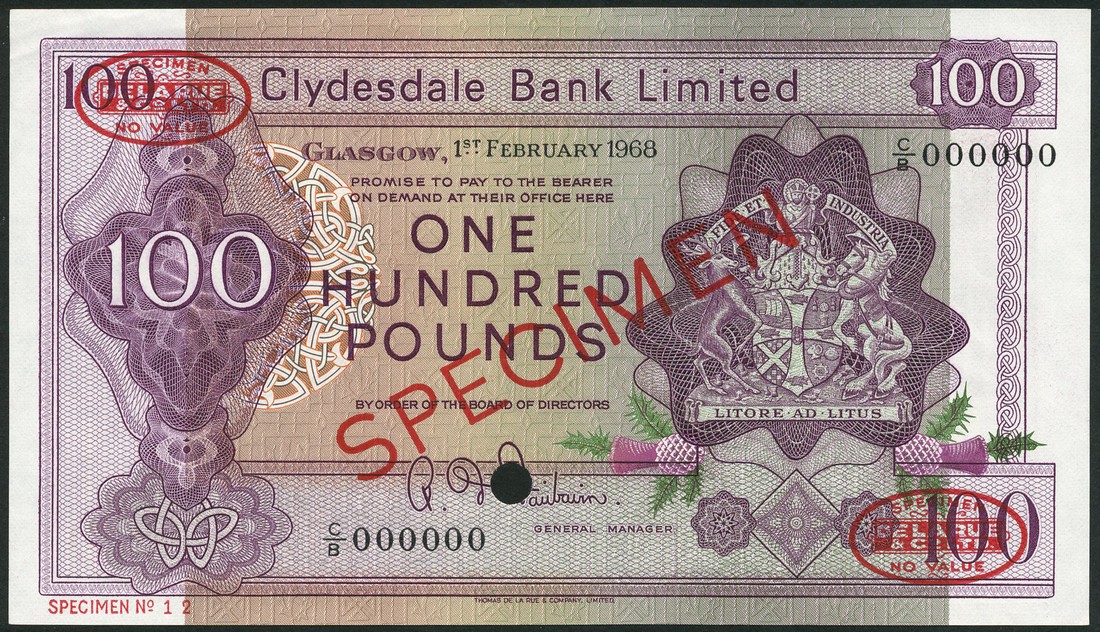 (†) Clydesdale Bank Limited, specimen £100, 1 February 1968, serial number C/B 000000, signature Fairbairn, violet on multicoloured underprint, arms at right, value in ornate guilloche at left, reverse river bridge and river scene, overprinted SPECIMEN in red with two De La Rue specimen ovals on obverse and reverse, one punch hole