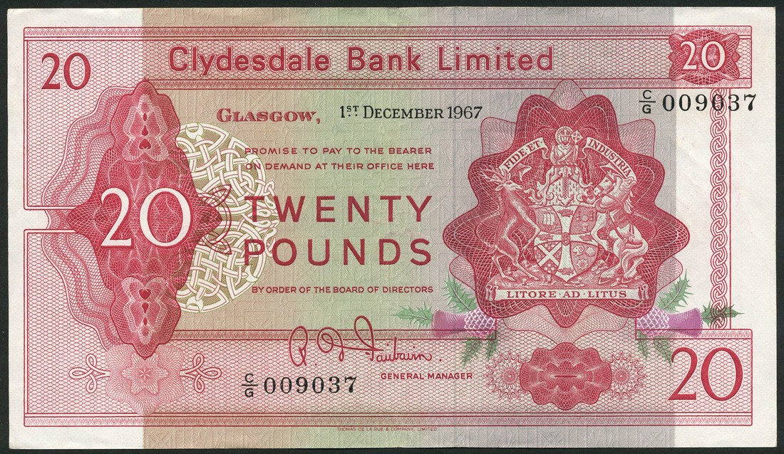 Clydesdale Bank Limited, £1, 1 July 1942, blue and orange, allegorical figures at lower left and right, arms at top, reverse bank seal and value in guilloches; £1, 30 March 1966, green, arms at right, reverse ships; £5, 18 April 1966, blue, arms at right, reverse King's College Aberdeen; £20 (3), 19 December 1964, 1 December 1967 (2), red and multicoloured, arms at right, reverse George Square, Glasgow