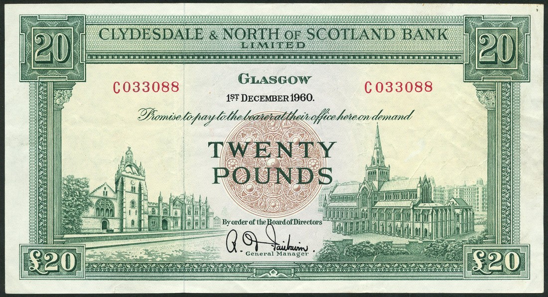 Clydesdale & North of Scotland Bank Limited, £5, 1951, red prefix A, purple and pale green and £20, 1960, red prefix C, green and pale yellow, both Kings College at left, Glasgow Cathedral at right, Campbell and Fairbairn signatures respectively