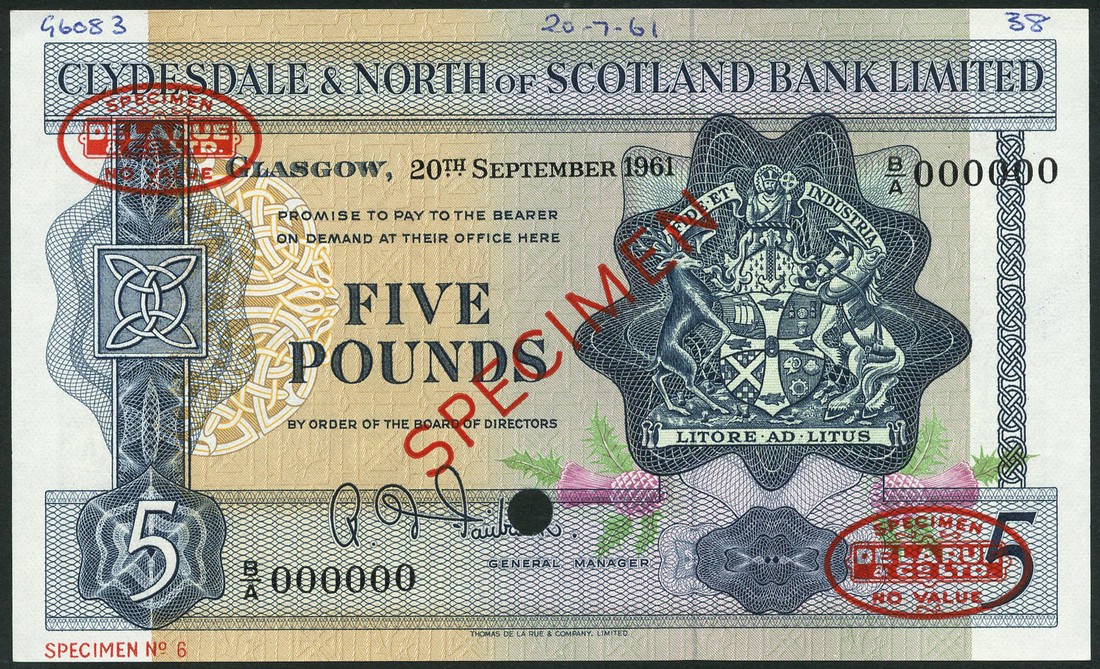 (†) Clydesdale & North of Scotland Bank Limited, specimen £5 (2), 20 September 1961 and 1 June 1962, serial numbers B/A 000000 and B/E 000000 respectively, both signature R. D. Fairbairn, dark blue on multicoloured underprint, arms at right, Celtic pattern in square at left, value at lower left and right, reverse King's College, Aberdeen, both overprinted SPECIMEN in red with two De La Rue specimen ovals on obverse and reverse, one punch hole