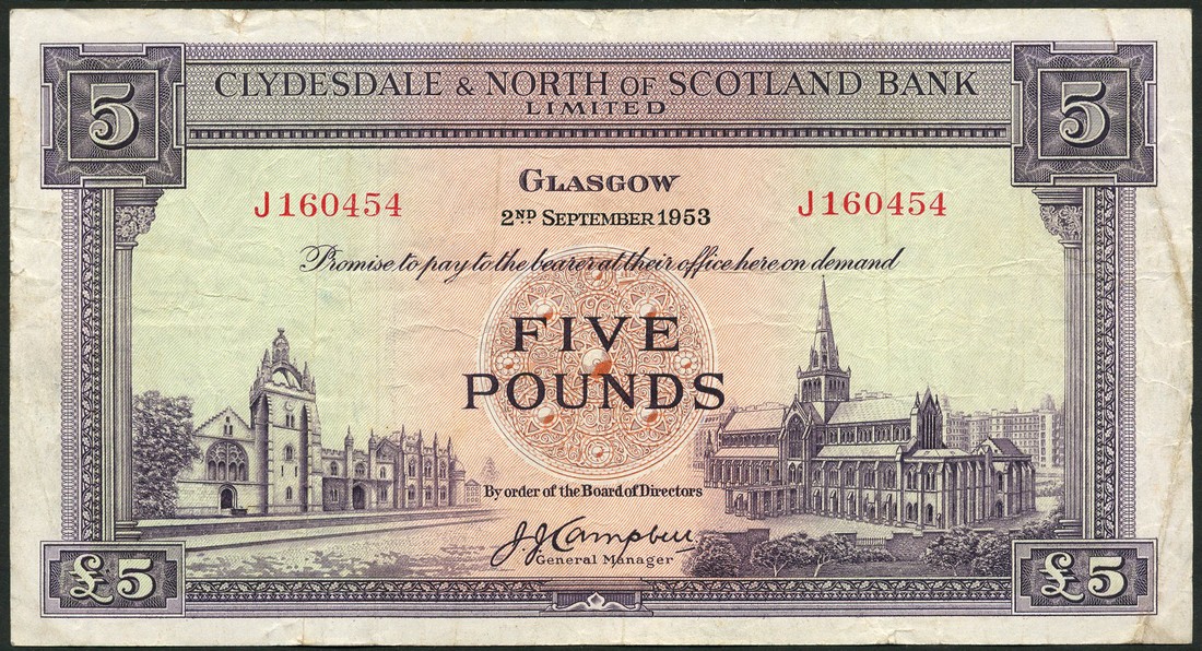Clydesdale & North of Scotland Bank, £1, 1 March 1952, blue, ships and landscape, reverse river scene; £5 (4), 2 May 1951, 2 September 1953 (2), 1 November 1956,all signature Campbell, purple, King's College Aberdeen at left, Glasgow Cathedral at right; also £5, 17 February 1963, blue, arms at right, reverse King's College, Aberdeen