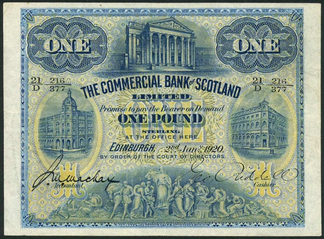 Commercial Bank of Scotland Limited, £1, 2 January 1920, serial number 21/D 216/377, blue and yellow, bank offices top centre and at left and right, Mackay and Riddell signatures, reverse blue, arms at centre