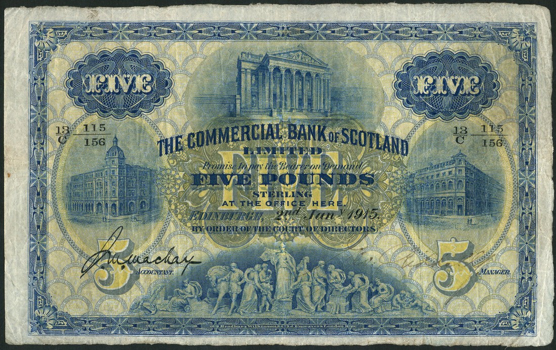 The Commercial Bank of Scotland Limited, £5, 2 January 1915, serial number 13/C 115/156, blue on yellow underprint, views of Head Office building at upper centre, left and right, frieze of allegorical figures from pediment of Head Office building at lower centre, one printed signature and one manuscript signature, reverse blue, bank seal at centre in ornate engraved pattern
