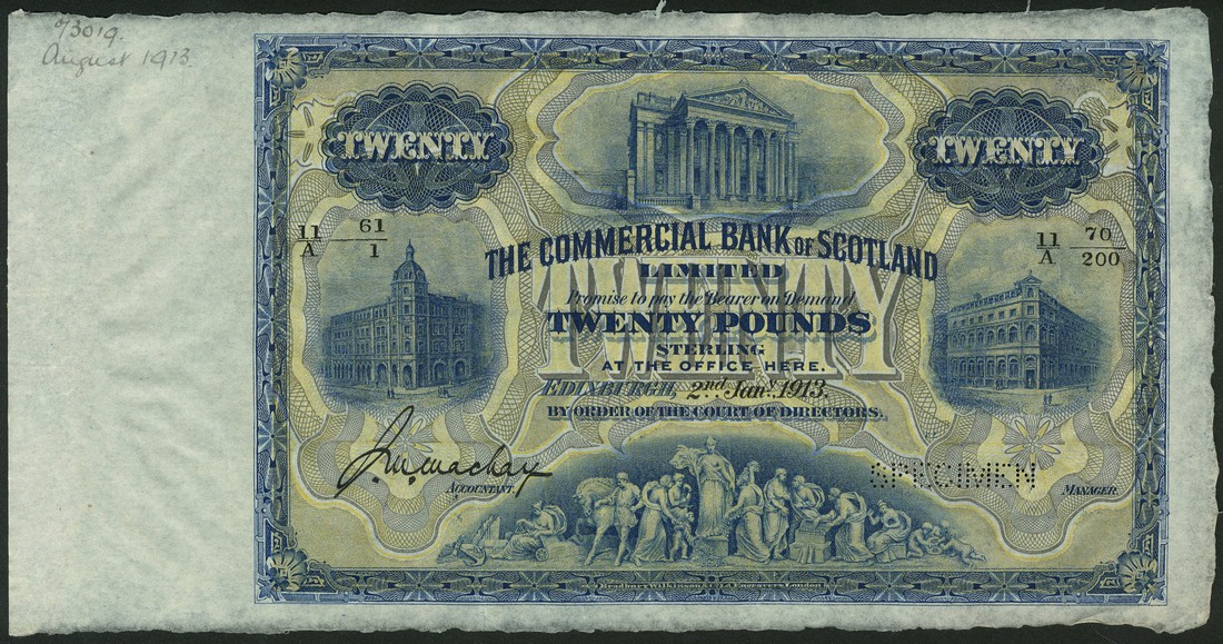 The Commercial Bank of Scotland Limited, printers archival specimen £20, 2 January 1913, serial number range 11/A 61/1 to 11/A 70/200, blue on mauve and yellow underprint, frieze at low centre, bank buildings at left and right and top centre, value at centre and each corner, reverse mauve, bank emblem at centre, perforated SPECIMEN