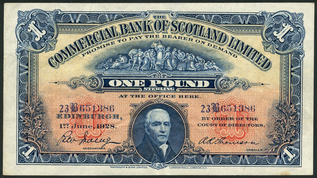 Commercial Bank of Scotland Limited, £1 (2), 1 June 1928 and 12 February 1936, blue on yellow and orange underprint, stone frieze from bank portico at upper centre, John Pitcairn at lower centre, reverse bank building with value in guilloches at left and right; also £1 (2), 3 January 1949, both prefix 26H, purple, Lord Cockburn at top right, reverse coat of arms