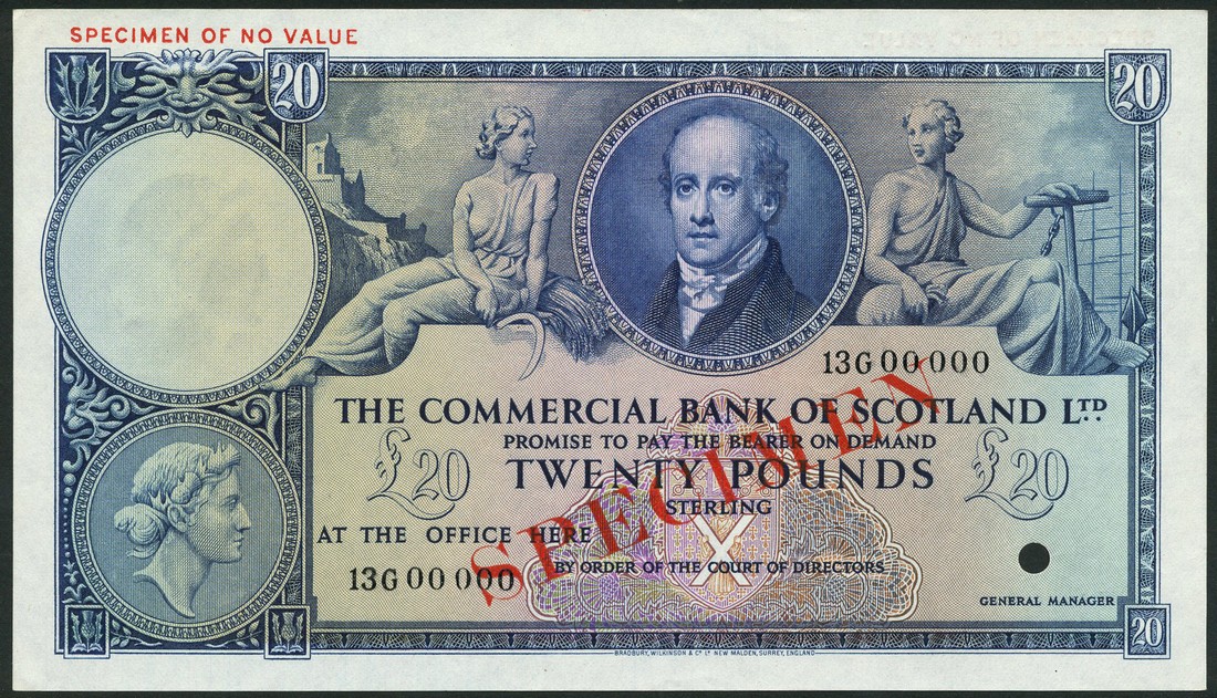 The Commercial Bank of Scotland Limited, specimen £1 and £20, ND (1947), first purple, second blue, both on multicolour underprint, Lord Cockburn at top right, both with red SPECIMEN overprints and once small cancellation hole