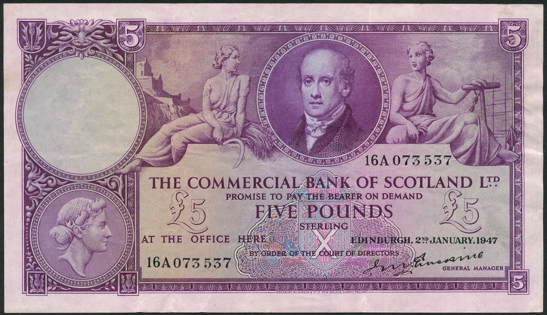 The Commercial Bank of Scotland Limited, £5 (4), 1947, 1949, 1953 and 1954, purple on multicolour underprint, Lord Cockburn at top right