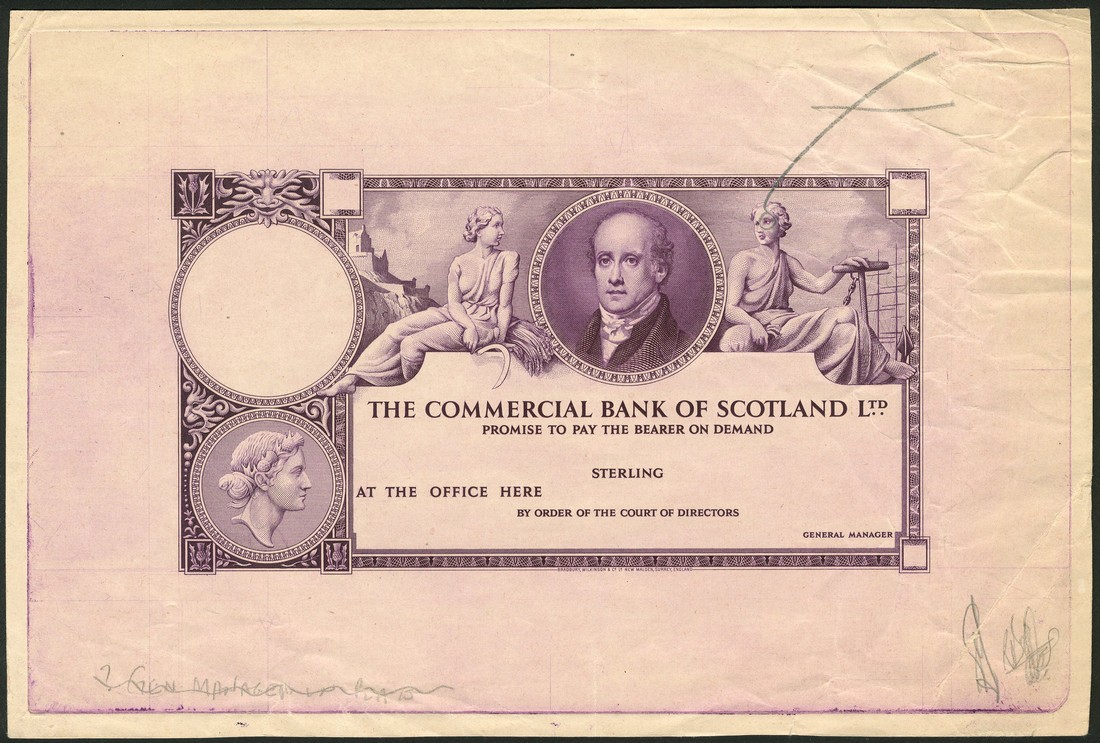 Commercial Bank of Scotland Limited, obverse and reverse die proofs for £100, ND (1947-53), purple, obverse partially printed, showing Lord Cockburn and female allegories at top centre, medallic female head at low left, reverse complete, bank building and street scene, also a proposed reverse proof for a c.1933 issue, green, with bank bulding at centre