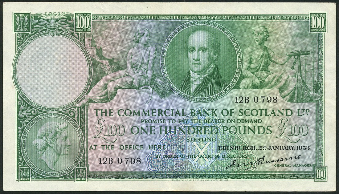 The Commercial Bank of Scotland Limited, £100, 2 January 1953, serial number 12B 0798, green on multicolour underprint, Lord Cockburn at top centre right, flanked by female allegories, medallic female head at low left