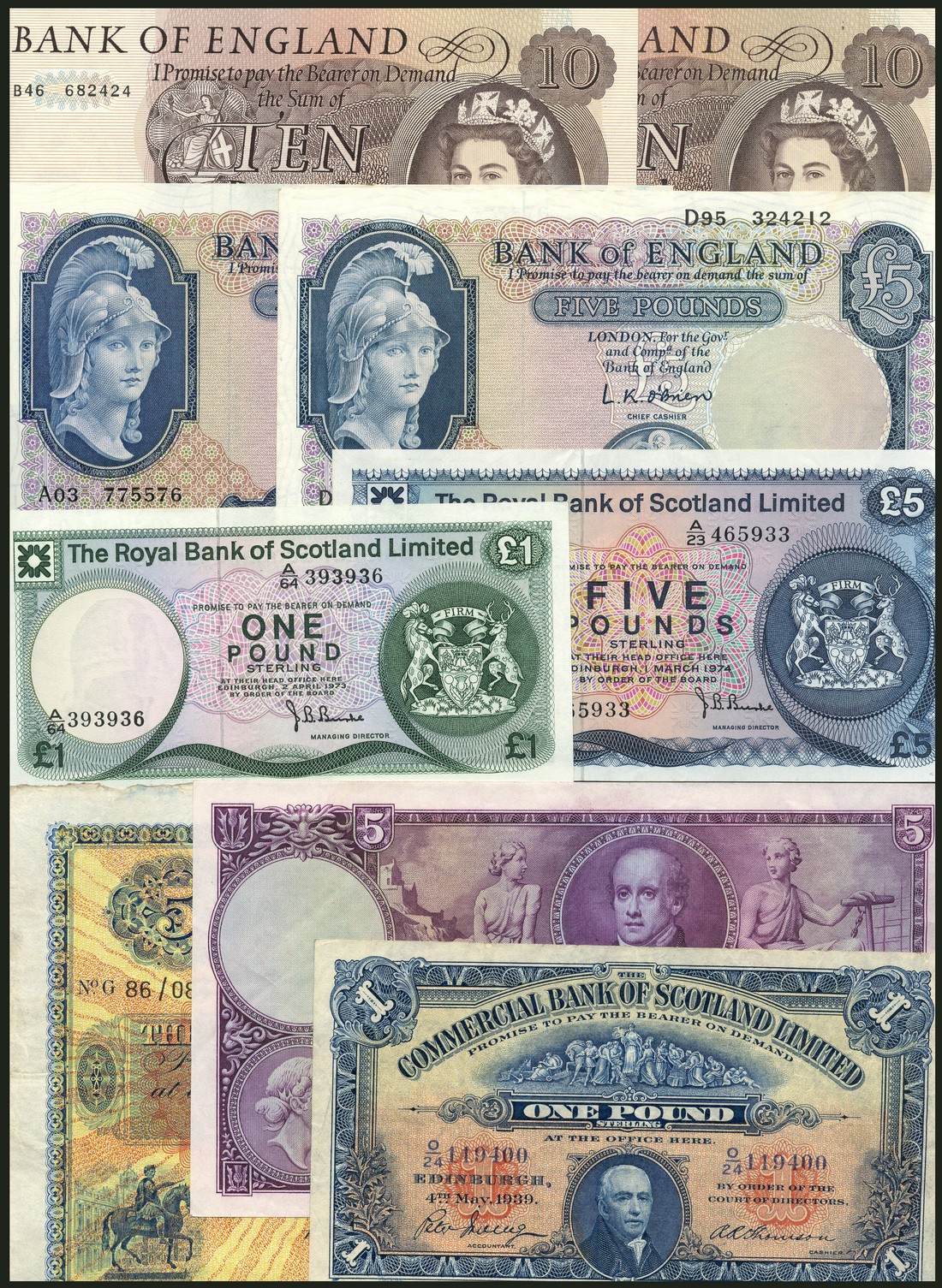Commercial Bank of Scotland, group of notes including £1, 4 May 1939, serial number O/24 119400, Union Bank of Scotland, £5, 31 August 1944, serial number G 86/084, Commercial Bank of Scotland, £5, 3 January 1951, serial number 16N028642, purple, also Royal Bank of Scotland £1, 1973, £5, 1974, Bank of England £5 (2), 1957 and Bank of England £10 (2), 1967