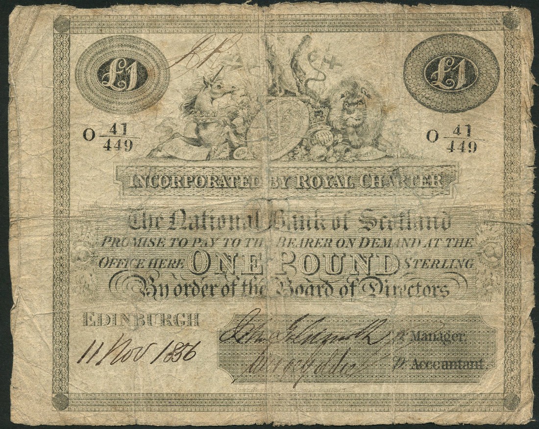 National Bank of Scotland, £1, 11 November 1856, serial number O 41/449, black and white, arms at top centre, value at centre, and top left and right, two manuscript signatures
