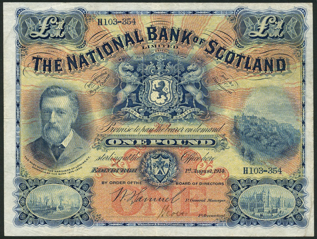 National Bank of Scotland Limited, £1, 1 August 1914, serial number H103-354, dark blue on orange and yellow underprint, Marquess of Lothian at left, arms at centre, Edinburgh Castle at right, reverse dark blue, view of Edinburgh at centre
