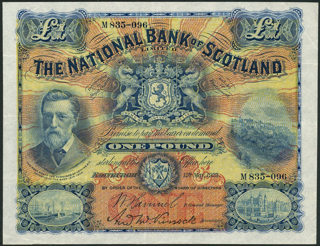 National Bank of Scotland, £1, 15 May 1923, serial number M835-096, and yellow with a red sunburst design in background, The Marquess of Lothian and the Clyde at left, Edinburgh Castle and Holyrood Palace at right, arms at centre, manuscript signature and printed signature of Samuel and Vissock low centre, reverse blue, Princes Street and value