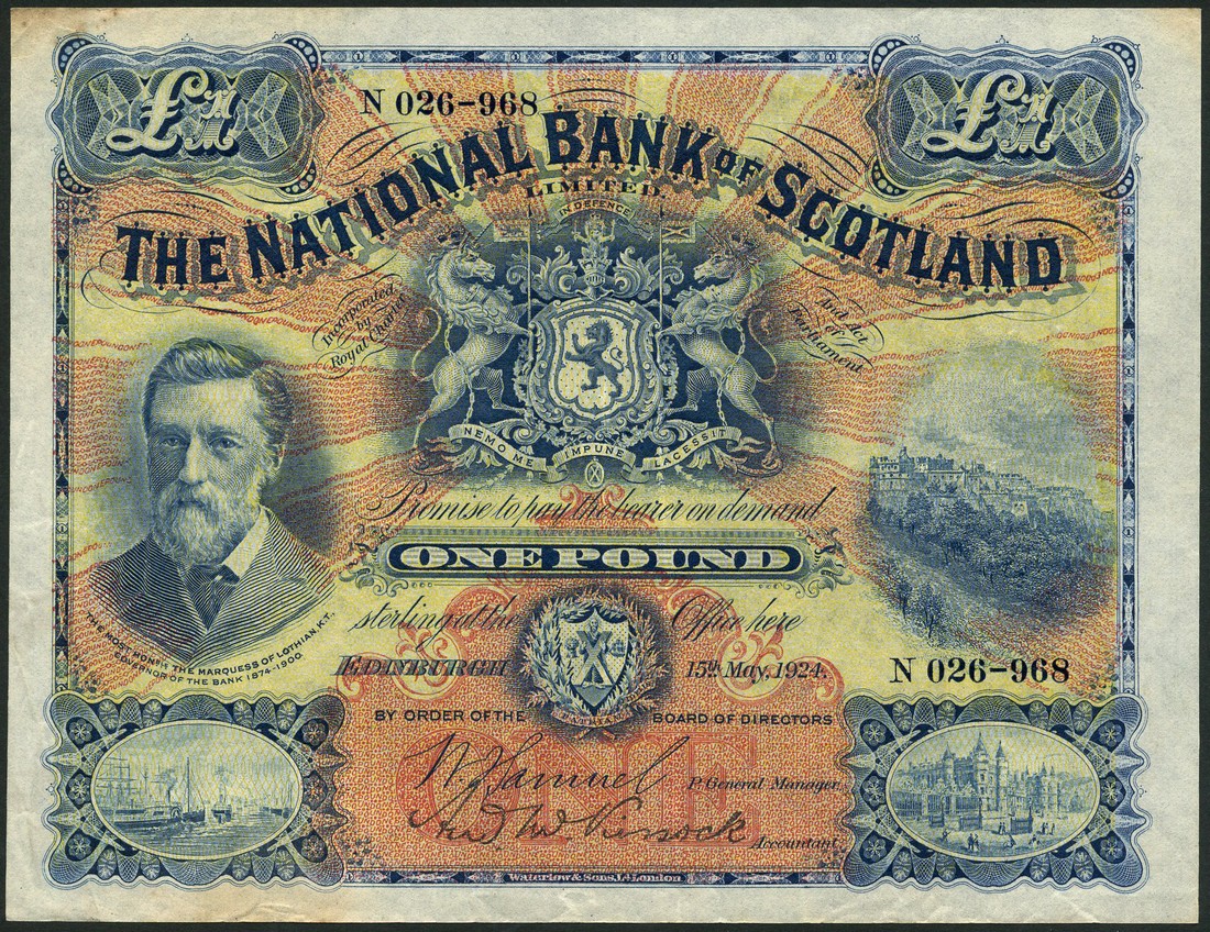National Bank of Scotland Limited, £1 (2), 15 May 1924 and 15 May 1925, both prefix N, dark blue on orange and yellow underprint, Marquess of Lothian at left, arms at centre, Edinburgh Castle at right, Samuel and McKissock/Lethbridge and McKissock signatures, reverse dark blue, view of Edinburgh at centre