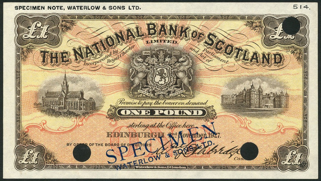 National Bank of Scotland Limited, specimen colour trial £1, 2 November 1927, brown on yellow and orange underprint, Arms at centre, Glasgow Cathedral at left, Holyrood House at right, value at centre and each corner, reverse red, view of Edinburgh, dark blue SPECIMEN overprint, three large cancellation holes