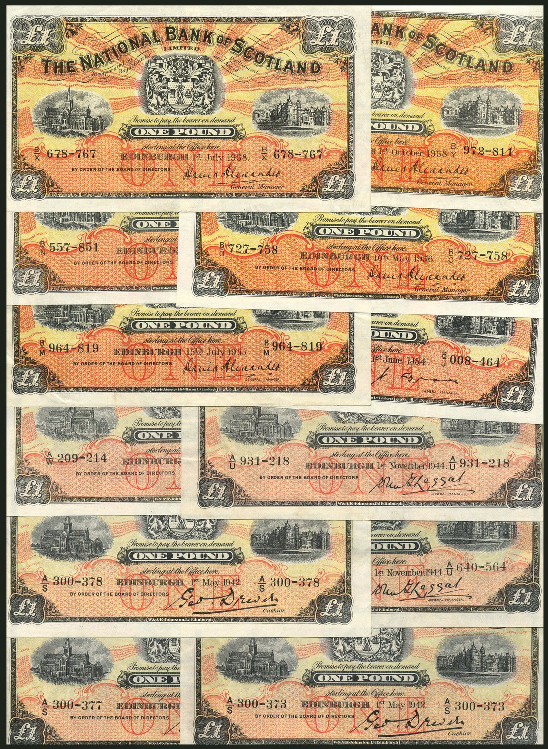 National Bank of Scotland Limited, £1 (12), 1942 (3),1944 (2),1947,1954,1955,1956(2),1958(2), black, pale red and yellow, arms at centre, various signatures