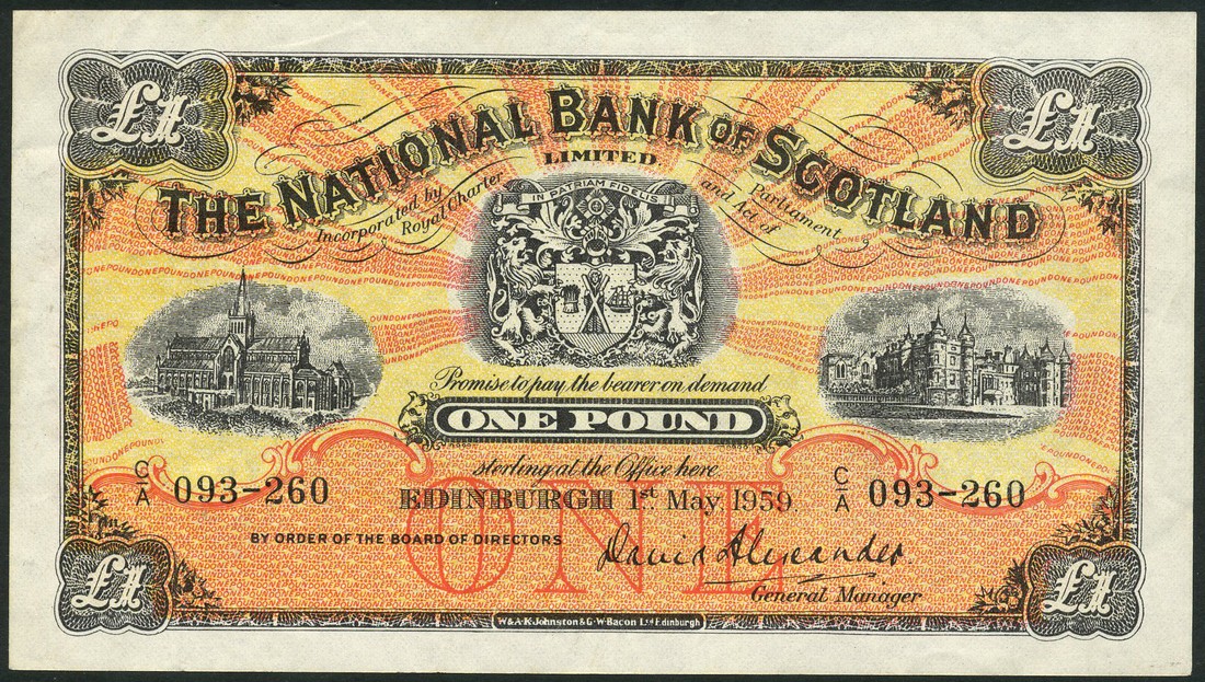 National Bank of Scotland, £1, 1 May 1959, prefix C/A, black, orange-brown and pale yellow, arms top centre, Glasgow Cathedral and the Palace of Holyrood House, Alexander portriat