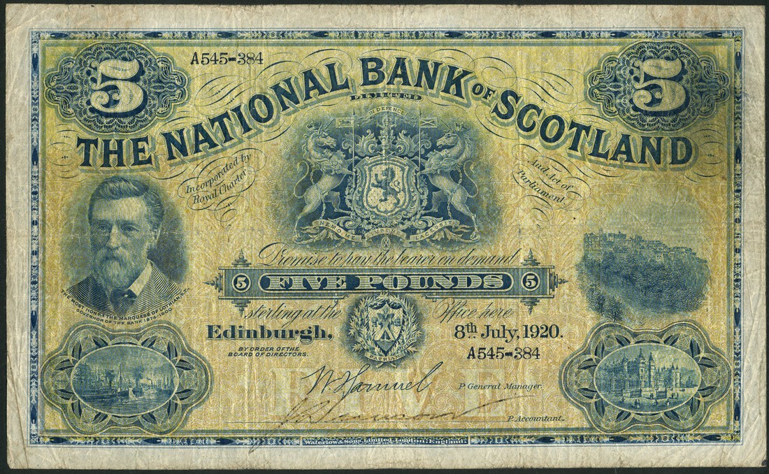 National Bank of Scotland Limited, £5, 8 July 1920, serial number A545-384, blue on yellow and orange underprint, Marquess of Lothian at left, arms at centre, Edinburgh Castle at right, manuscript signature and printed signature of Samuel, reverse view of Edinburgh