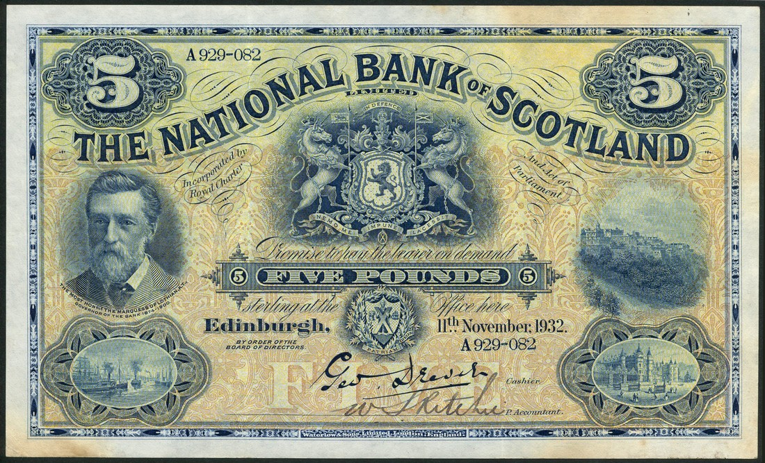 National Bank of Scotland Limited, £5 (2), 11 November 1932 and 6 July 1942, blue on yellow and orange underprint, Marquess of Lothian at left, arms at centre, Edinburgh Castle at right, reverse view of Edinburgh