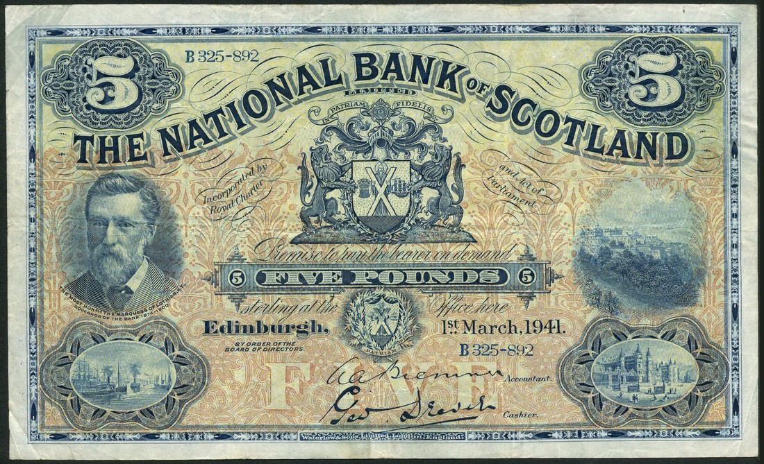 The National Bank of Scotland Limited, £5 (2), 1 March 1941, serial number B325-892, and 1 March 1952, serial number C845-692, both blue, red and yellow, Marquis of Lothian at left, arms at upper centre, vignettes of shipping on the River Clyde, Holyrood Palace and Edinburgh Castle at lower left and right, reverse view of Edinburgh from Calton Hill