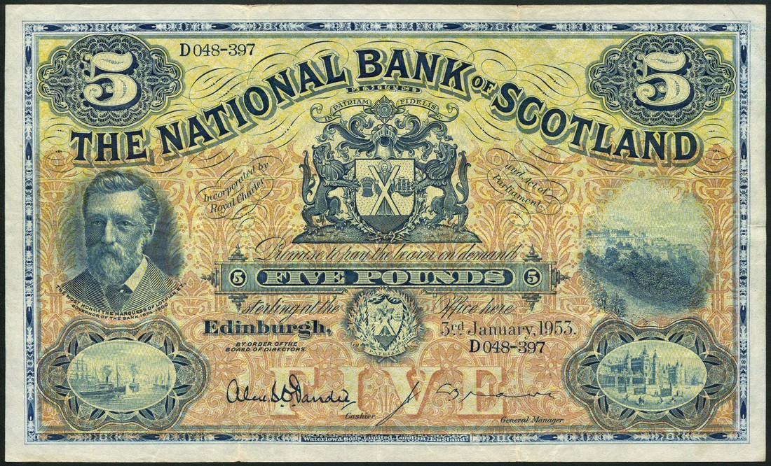 National Bank of Scotland Limited, £5 (4), 1953, 1953, 1955 and 1956, blue on yellow and orange underprint, Marquess of Lothian at left, arms at centre, Edinburgh Castle at right, reverse view of Edinburgh