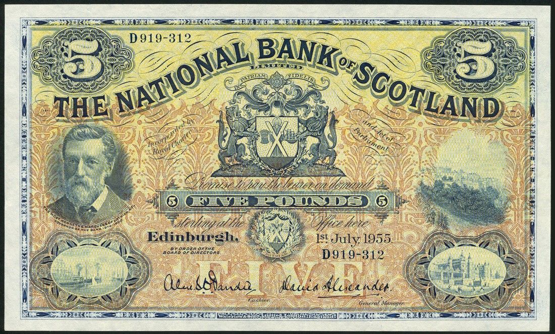 National Bank of Scotland Limited, £5, 1 July 1955, serial number D919-312, blue and yellow with a red sunburst design in background, The Marquess of Lothian and the Clyde at left, Edinburgh Castle and Holyrood Palace at right, arms at centre, Dandie and Alexander signatures, reverse blue, Princes Street and value at left and right, and £5, 1 December 1955, serial number E320-205, colour and design as previous