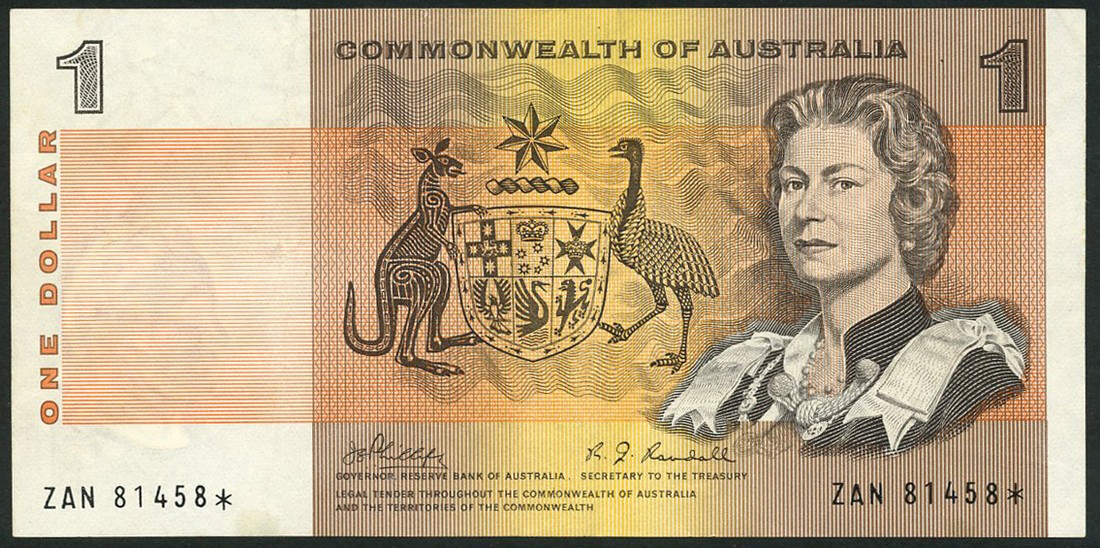 (x) Commonwealth of Australia, 1 dollar, ND (1969), serial number ZAN81458*, Phillips/Randall signature, dark brown on orange and multicolour underprint, Queen Elizabeth II at right, arms at centre, reverse aboriginal art