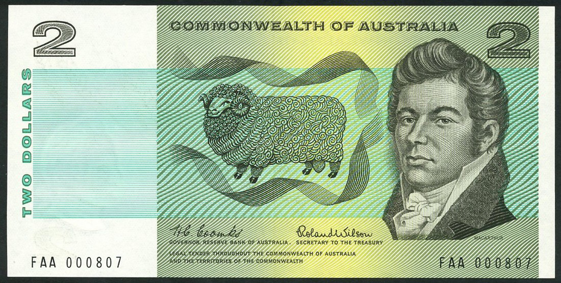(x) Commonwealth of Australia, $2, ND (1966), serial number FAA 000807, green and multicoloured, McArthur at right, ram at centre, Coombs-Wilson signatures
