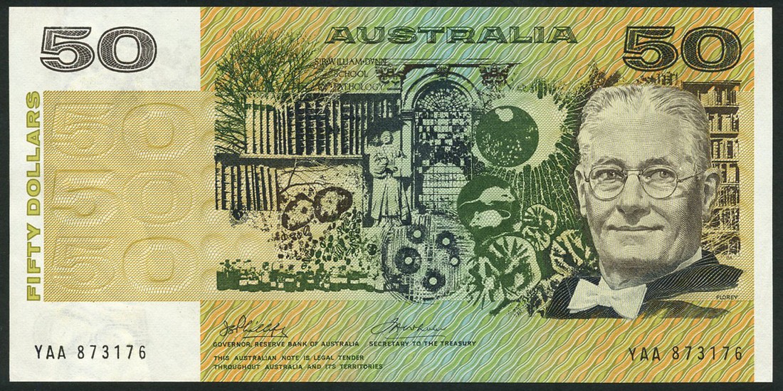 (x) Commonwealth of Australia, 50 dollars, ND (1973), serial number YAA 873176, Phillips/Wheeler signature, dark brown and black on multicolour underprint, Lord Howard Walker Florey at right, reverse Ian Clunies-Ross at left, research facility at centre