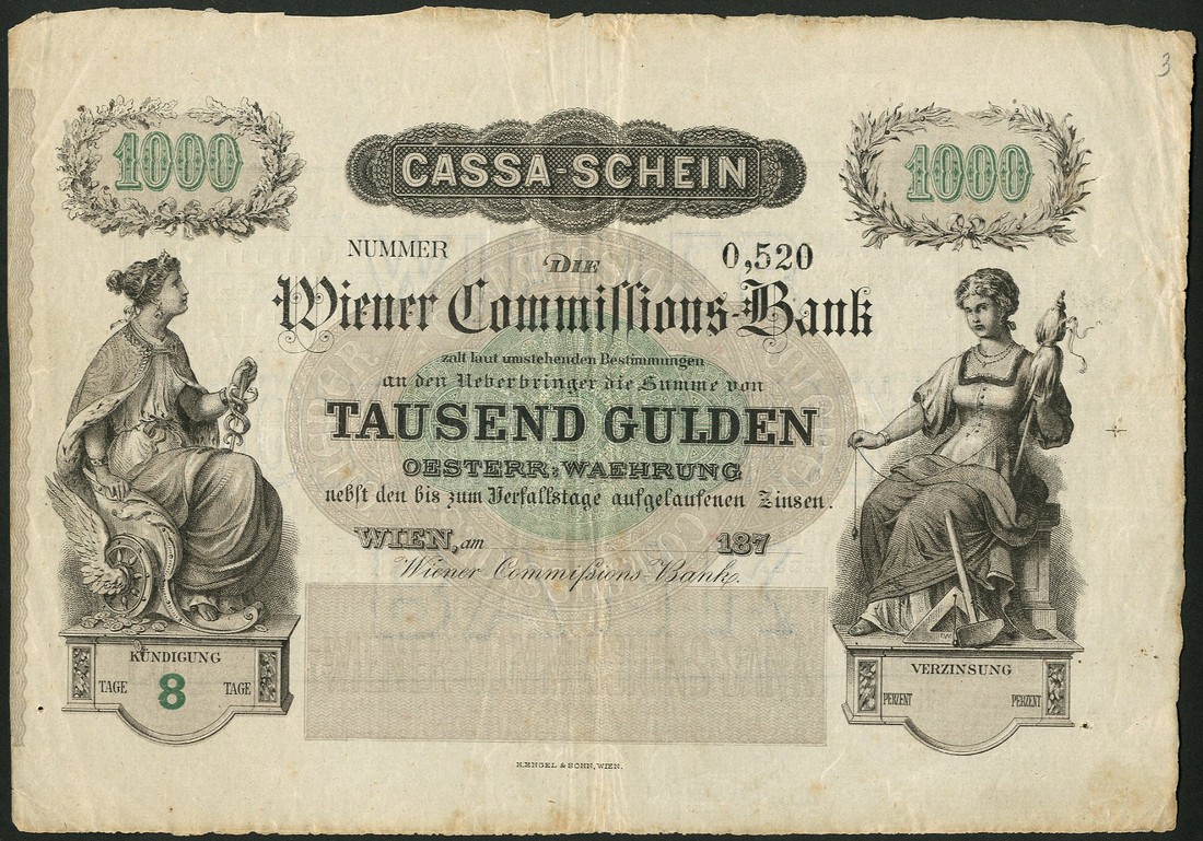 Wiener Commissions Bank, unissued 1000 gulden, 187-, serial number 0,520, black on green and grey underprint, female allegories at left and right, value at centre and top corners