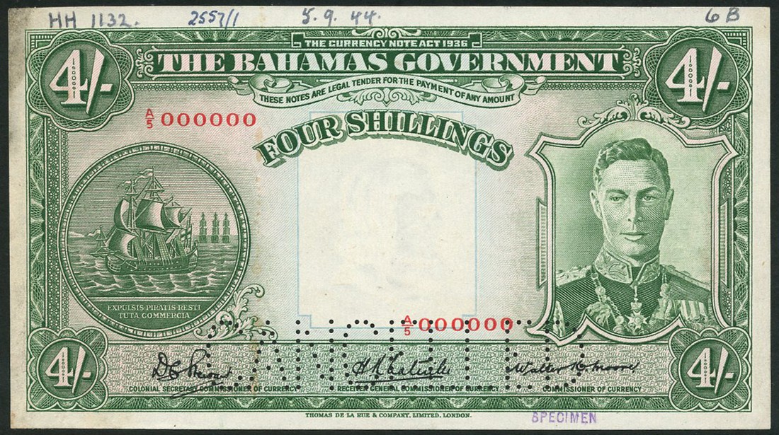 (x) Bahamas Government issue, specimen 4 shillings, ND (1936), red serial number A/5 000000, green and pale pink, George VI at right, ship seal at left, Stewart, Latreille and Moore signatures, reverse multicoloured, arms at left, value at right