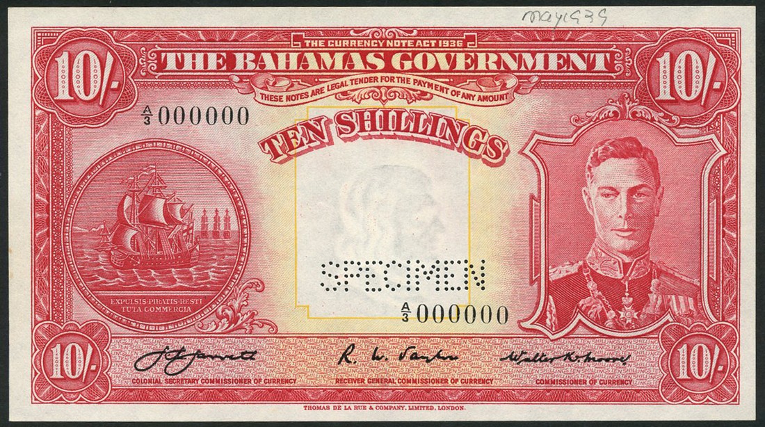 (x) Bahamas Government issue, specimen 10 shillings, ND (1936), red serial number A/3 000000, red and pale orange, George VI at right, ship seal at left, Jarrett, Taylor and Moore signatures, reverse multicoloured, arms at left, value at right
