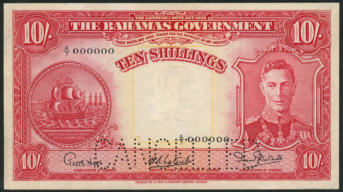 (x) Bahamas Government issue, specimen 10 shillings, ND (1936), red serial number A/7 000000, red and pale orange, George VI at right, ship seal at left, Higgs, Latreille and Burnside signatures, reverse multicoloured, arms at left, value at right