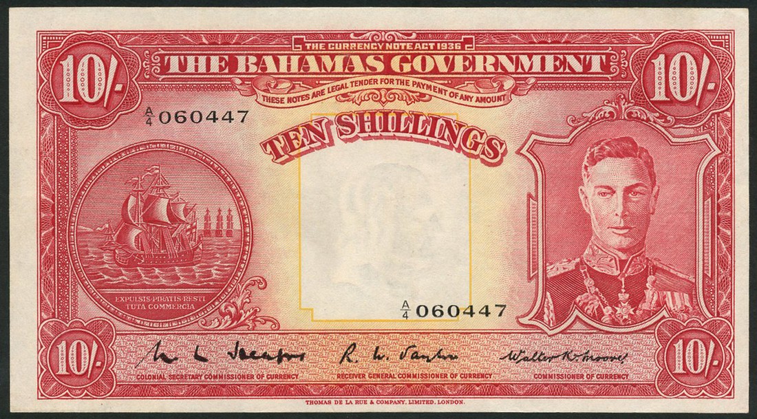 (x) Bahamas Government issue, 10 shillings, ND (1936), red serial number A/4 060447, red and pale orange, George VI at right, ship seal at left, Heape, Taylor and Moore signatures, reverse multicoloured, arms at left, value at right