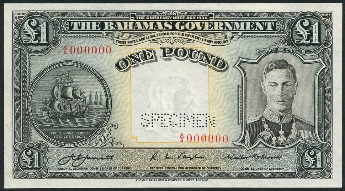 (x) Bahamas Government issue, specimen £1, ND (1936), red serial number A/3 000000, black and pale orange, George VI at right, ship seal at left, Jarrett, Taylor and Moore signatures, reverse multicoloured, arms at left, value at right