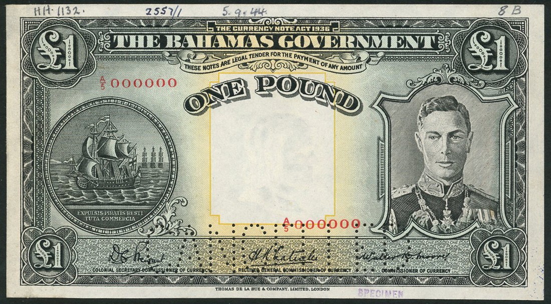 (x) Bahamas Government issue, specimen £1, ND (1936), red serial number A/5 000000, black and pale orange, George VI at right, ship seal at left, Stewart, Latreille and Moore signatures, reverse multicoloured, arms at left, value at right
