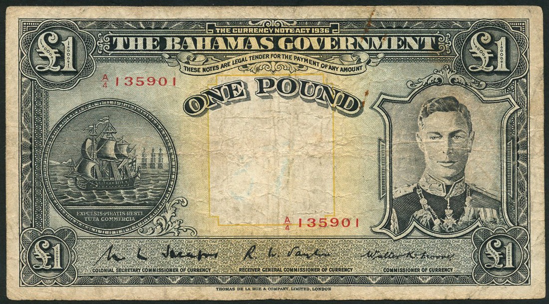 (x) Bahamas Government issue, £1, Law of 1936 (1941), serial number A/4 135901, signatures Heape, Taylor and Moore, signature title Colonial Secretary, Commissioner of Currency at left, black, King George VI at right, ship seal at left, reverse purple, orange and green, coat of arms at left, value in ornate guilloche at right