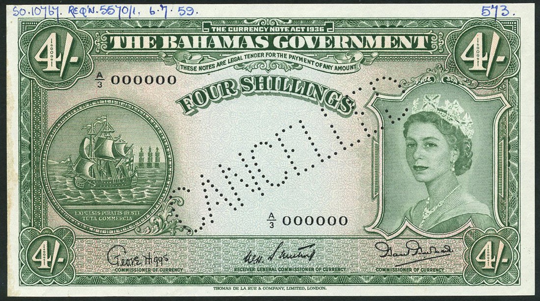 (x) Bahamas Government issue, specimen 4 shillings, ND (1953), black serial number A/3 000000, green and pale pink, George VI at right, ship seal at left, Higgs, Sweeting and Burnside signatures, reverse multicoloured, arms at left, value at right