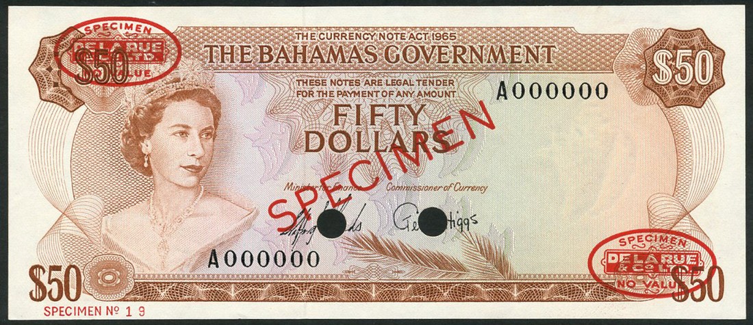 (x) Bahamas Government issue, specimen $50, ND (1965), serial number A 000000, brown and red and pale blue and pink, Elizabeth II at left, Sands and Higgs signatures