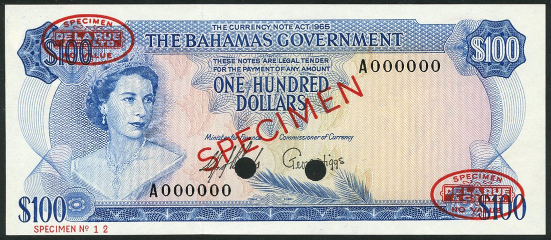 (x) Bahamas Government issue, specimen $100, ND (1965), serial number A 000000, blue and pale pink and orange, Elizabeth II at left, Sands and Higgs signatures