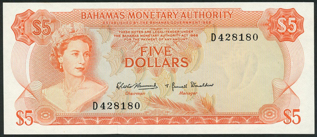 (x) Bahamas Monetary Authority, $5 (2), ND (1968), serial number D 428180/825591, orange and pale blue, Elizabeth II at left, Hammond and Donaldson signatures